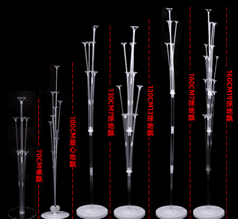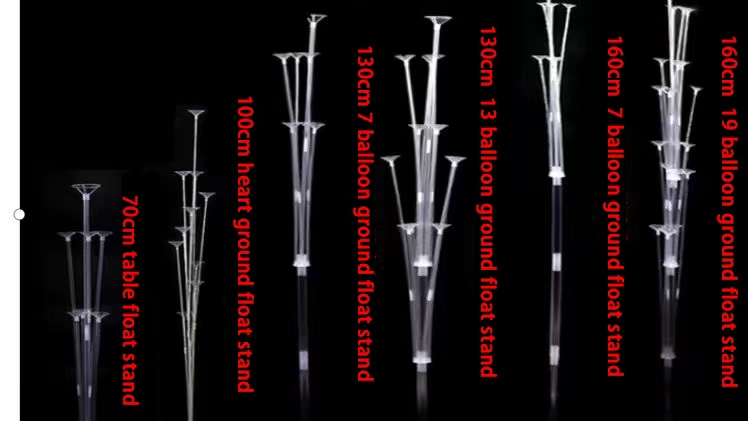 Производот на балони „STANDS“ е да обезбеди стабилна рамка за поддршка и моделирање на балонот, да го поправи балон-производот во одредена позиција според побарувачката и да го комбинира балонот во разни тродимензионални форми како што се лак, балон дрво, loveубов, итн. Преку различни типови на штандови, како што се лак, столб, табела и земја, итн., За да се додаде визуелен фокус на местото на активност. Поправете го балонот на земја, маса, агол и други назначени позиции за да спречите балонот да лебди по своја волја и да се обезбеди дека распоредот на декорацијата е чист и уреден.