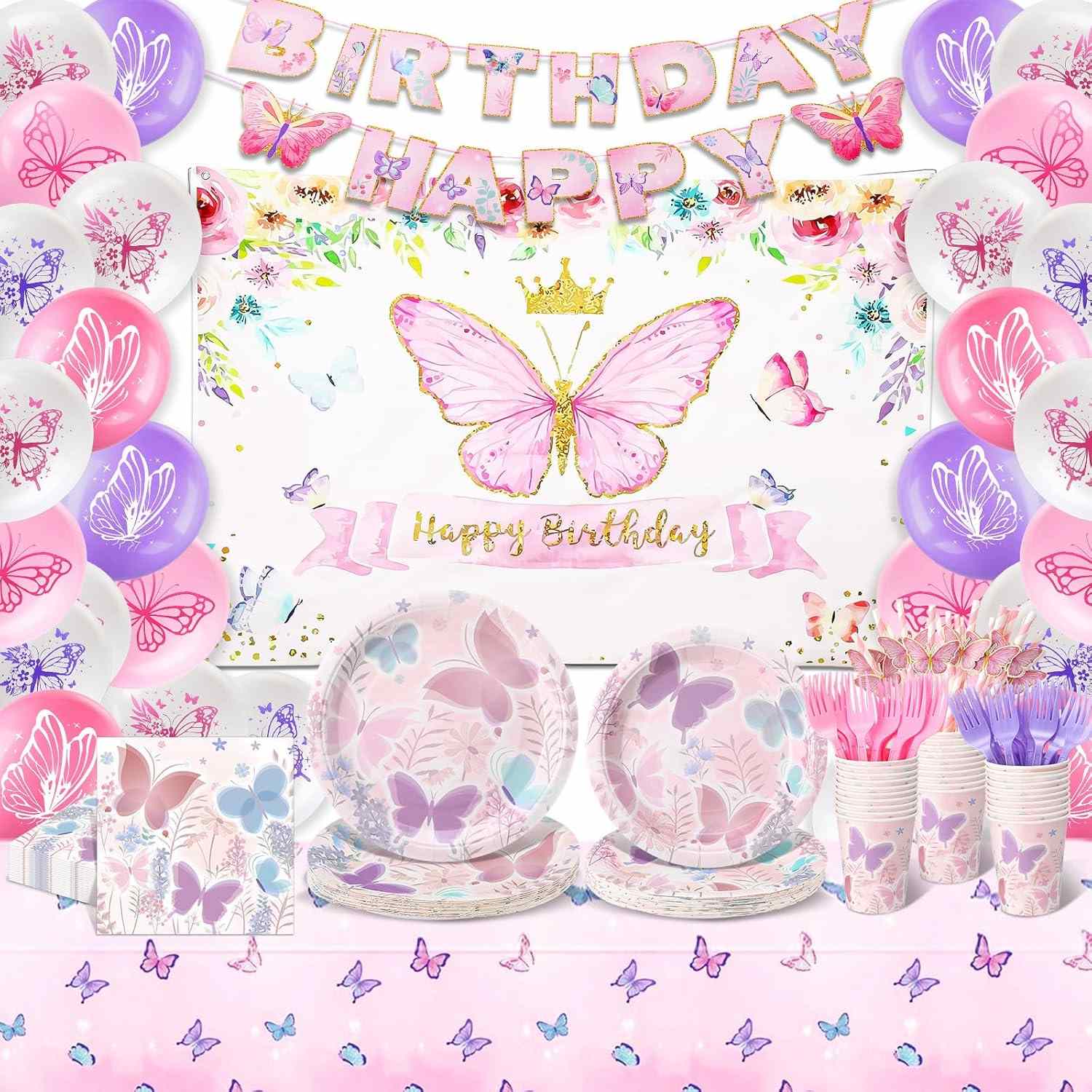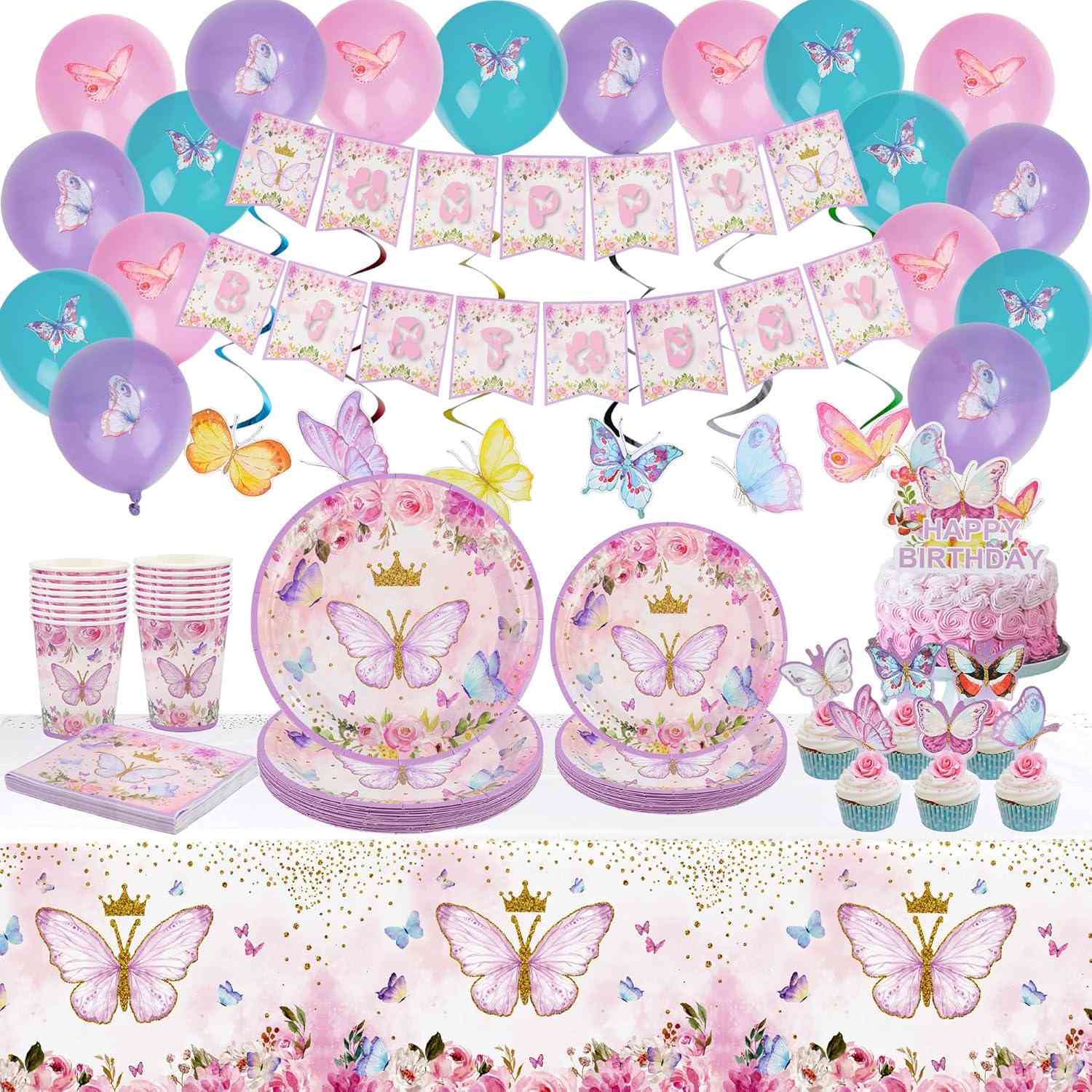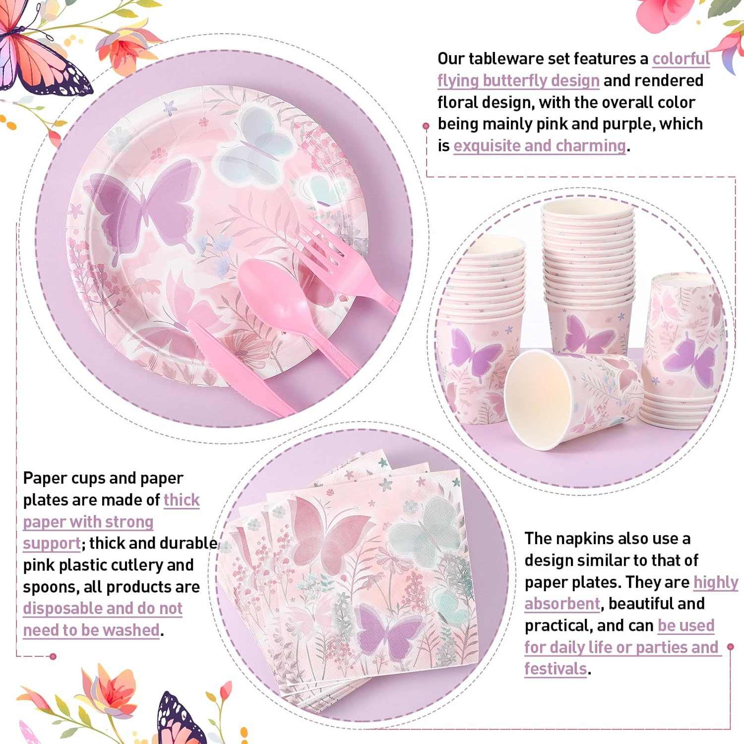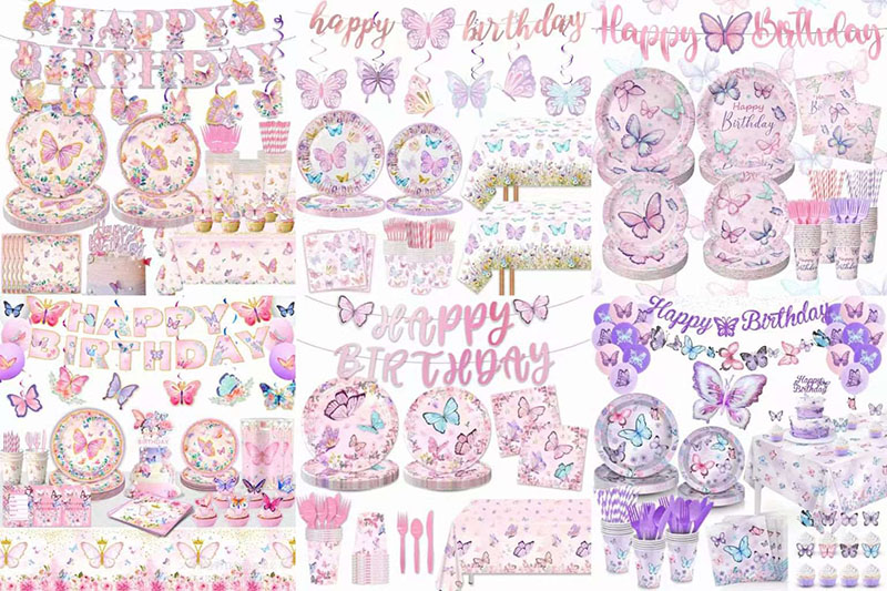 Одлична опција за декорација на забави е комплетот прибор за забава со пеперутки. Вклучени се салфетки, хартиени чинии, хартиени чаши, вилушки и ножеви. Секое парче покажува делови од пеперутки.