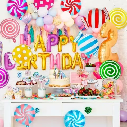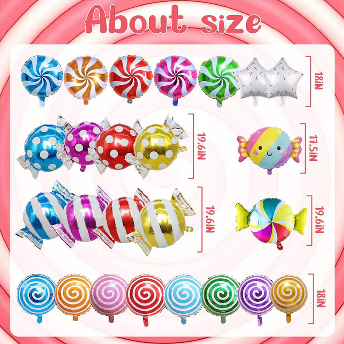 Балонот за бонбони со фолија е со големина од околу 18 инчи и со вистинската големина. Без разлика дали е спарен со балон -лак за лак или како декорација за мала семејна забава, може да се меша во хармонично без да се појави нагло. Овој балон со фолија има светло сина, светло розова, розова црвена, светло зелена, жолта, итн. Балони со бонбони со различни форми се доволни за да создадат силна и слатка атмосфера и изненадувачки пријатели кои сакаат продавници за десерти.