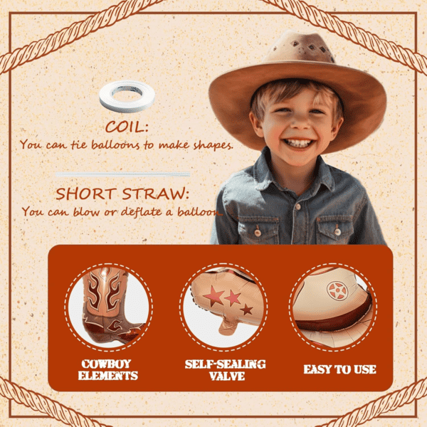Балони од каубојска фолија со хелиум:Наполнете ги балони од каубојска фолија и сродните балони од латекс со хелиум, тие ќе го задржат ефектот на лебдење нагоре. Без разлика дали е поставен во продавница или изложен на улица, може да привлече сечие внимание. Згодните балони од фолија за коњи, балони од фолија за каубојски капи со широк обод и балони од каубојска фолија што горат од пламен - сите тие се едноставно неодоливи.