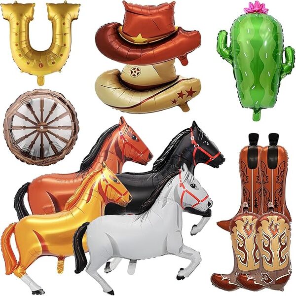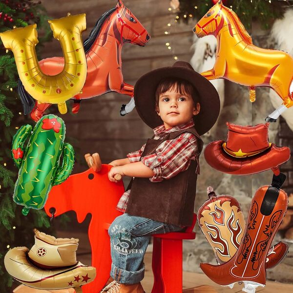 Достапни во разновидни дизајни, од слатки капи и чизми до разиграни коњи, потковици и живописни кактуси: овие производи се совршени избори за тематски забави, филмски вечери, родендени и секакви свечени настани.Балони од каубојска фолијасе направени од специјално дизајниран висококвалитетен композитен филм. Еластичен е и веројатно нема да експлодира. Можете исто така да го користите повеќе пати по соодветно складирање. Тие се со светли бои и поседуваат голема експресивна моќ. Можете да ги користите за да создадете разни комбинации. На пример, користејќи балони од фолија од 5-10 парчиња (стилови на коњи, стилови на капи, стилови на чизми..), и 60 парчиња латекс балон во кафеава, бела, црна боја и други додатоци (заднина, банери...) за да го направите комплетот за венец со балони од каубојска фолија. Може да додаде силен американски вестерн вкус на вашата забава, овозможувајќи ви да се чувствувате како самите да сте каубојот. Можете да го користите на родендени, празници или на настани. Ако сте љубител на вестерн филмови, оваа тема би била совршена за вас. Достапни се балони за забава со каубојска фолија за масовно купување за да ви помогнат да ги намалите трошоците и да го зголемите профитот од препродажба, што ги прави врвен избор за планерите на настани, продавниците за набавки за забави и препродавачите.