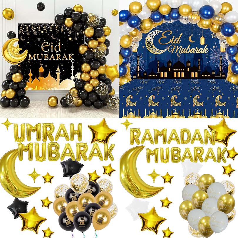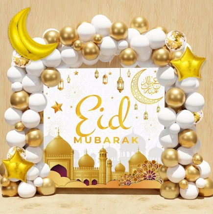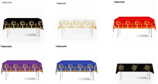 Новововедениот комплет за балон за Бајрам додава ткаенина за позадина, покривка за маса и други производи на претходните основни резервни делови. Позадинската крпа е дизајнирана со класични елементи за Бајрам, како што се позлатена полумесечина, арапски „Eid Mubarak“ и Lonicera japonica преплет. Бојата на заднината е нежно бела или светла камила боја, која не само што го задржува светото чувство на фестивалот, туку и ја интегрира топлата атмосфера на семејно собирање. Тоа е закачено на ѕидот на дневната соба, влезот или делот за активности на трговски центар, станува визуелен центар на сцената без комплицирана инсталација. Новододадената покривка за маса е изработена од PE материјал отпорен на масло и водоотпорен, со симетрични геометриски линии испечатени на површината и фини ресни точки на рабовите. Се поставува на трпезариска маса, маса за пријавување или кабина за храна. Не само што може да се справи со дамките од супа и десерти во забавата, туку и неговите празнични дезени можат да одекнуваат со украси како синџири за балони и знамиња, правејќи го изгледот на целото место поинтегриран - од балонот Гарланд во воздухот до деталите на работната површина, секое место го пренесува повторното обединување и радоста на Фитр Бајрам.