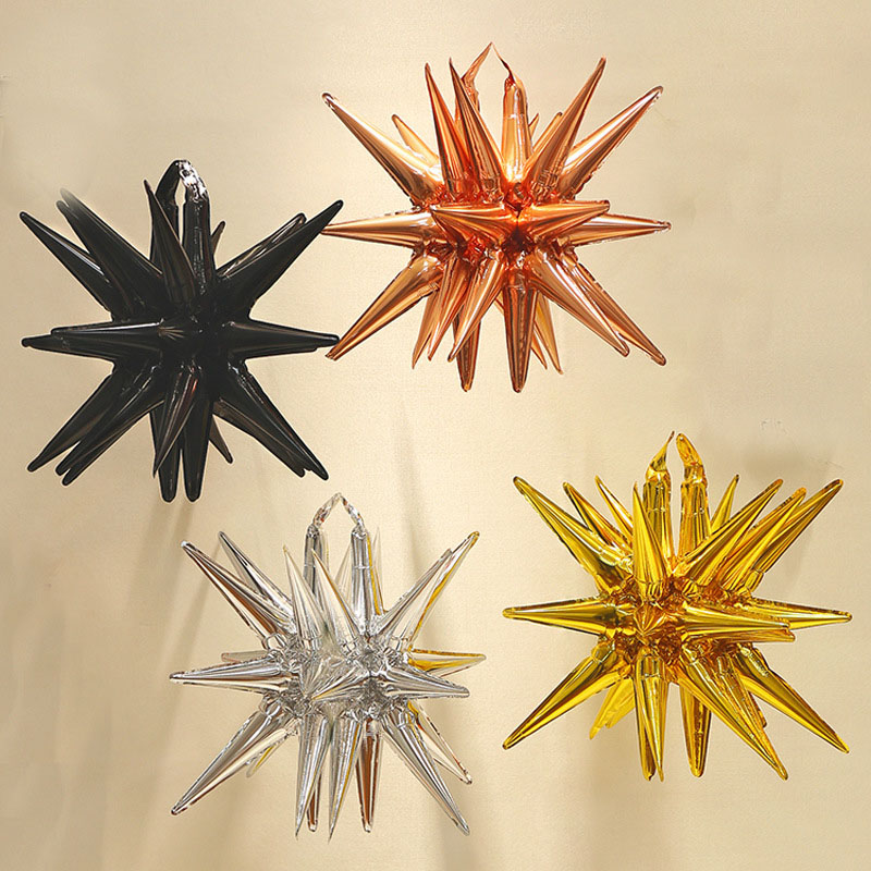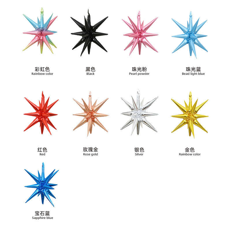 Моделирање на капки за вода што експлодира балони со фолија на starвезди: Производите се поделени на големи, средни и мали три димензии. Малата големина е погодна за декорација на работната површина или декорација на торта. Една мала starвезда за експлозија на вода е поставена покрај роденденската торта за да се подобри деликатес на масата за десерт. Средна големина е погодна за декорација на wallидови или декорација на завеси. Двајца се обесени на влезот, така што гостите можат да ја почувствуваат уникатната атмосфера при влегување во вратата. Голема големина е погодна за украс на wallидот во позадина или таванот. Главната позадина на свадбата усвојува големи капки вода и се совпаѓа со светла за целосно создавање чувство на високо ниво.