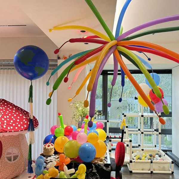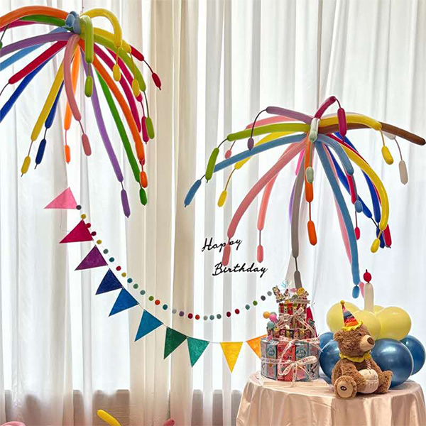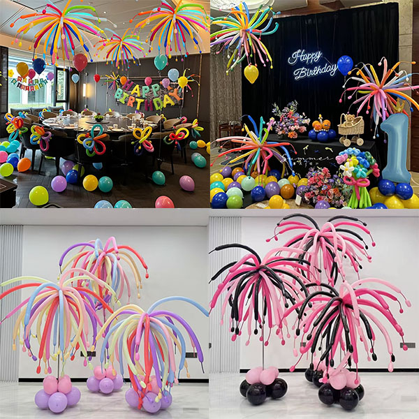 За дизајн на форма. Инспирацијата доаѓа од огномет што пука на ноќното небо. Тие се светли, динамични и привлечни. Совршено го копира обликот на огномет кога пукаат. Долгите ленти со балон се протегаат и се шират од центарот. Малите балони се додаваат на краевите. Тие изгледаат како искри да експлодираат огномет. Lifelike и живописно. Закачете ги на таванот на забавата. Или ставете ги на земја како украсни столбови. Тие создаваат прекрасен визуелен ефект на огномет што пука веднаш. Гостите на забави ќе се чувствуваат како да се наоѓаат во шоу за огномет. Потопено во среќна и жива атмосфера. Исто така, балонската база на дното е добро дизајнирана. Балони во форма на огномет со различни натпревари во боја. Нивните бази користат комбинации за совпаѓање на балони. Основата го одржува балонот стабилен. Исто така, ја подобрува целокупната декоративна убавина. Го прави целиот балон во форма на огномет интегриран од горе до дно. Станува убава глетка на забавата.