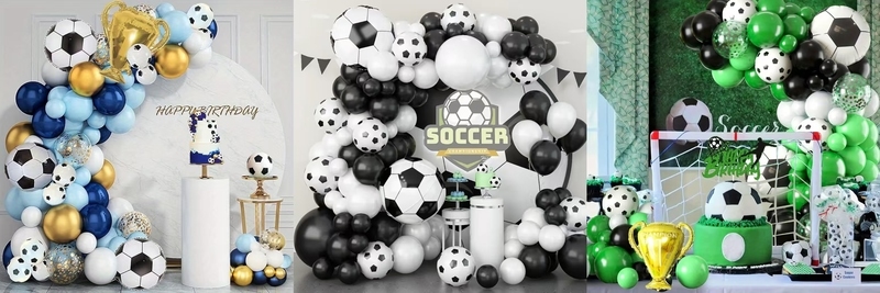 1. Кога ќе ги прилагодите комплетите за балони, можете само да користите зелени или сини балони и да ставите малкуфудбалски печатени балони, тогаш испадна дека е многу убав сет како на сликата подолу: