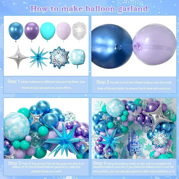 Комплетот за венец со балон за украси за замрзнати забави зема инспирација од популарната Frozen IP. Прецизно ги репродуцира боите од филмот. Комбинира ладни бои како сина, сребрена, виолетова и бела. Синото е како раното утринско небо на Арендел. Светло виолетова боја е како сјајот што го прекршуваат магични ледени кристали. Сребрените украси се како одраз на снегулки. Тие градат систем на бои со богати слоеви. Тие создаваат сонливо и елегантно визуелно искуство.