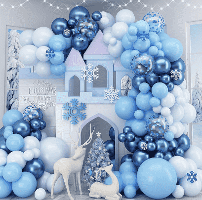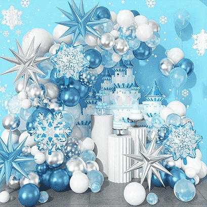 3.Комплети со венци со замрзнати балонобично содржат различни големини назамрзнати балони, уникатни балони од фолија, соодветни украсни ленти, надувувачи, необележани точки за лепак, монтажни врски и други додатоци за да се задоволат барањата за распоред на едно место. Сите компоненти се направени од безбедни и еколошки материјали, целосно прилагодени на сцените со активности на децата. Моделот на балон во оделото е внимателно усогласен, комбинирајќи ја класичната лична слика на Frozen со сонливите елементи на мраз и снег. Боите се сина, бела и сребрена, создавајќи чиста и романтична магична атмосфера.