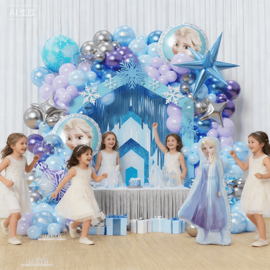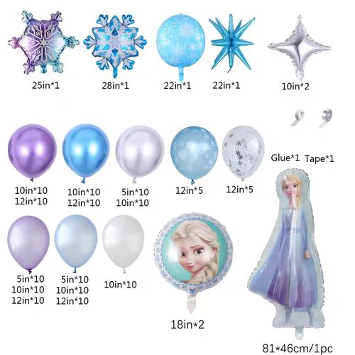 Балоните од фолија се главниот дел за сетот за лачни балон со тема Frozen. Тие главно вклучуваат балон од фолија за портрет на главата на принцезата, балон од фолија снешко. Балонот со фолија со број и балонот со буква фолија може да се додадат и за да се создаде повисока атмосфера за забава како да сакате декорации во стилот на роденденската забава.