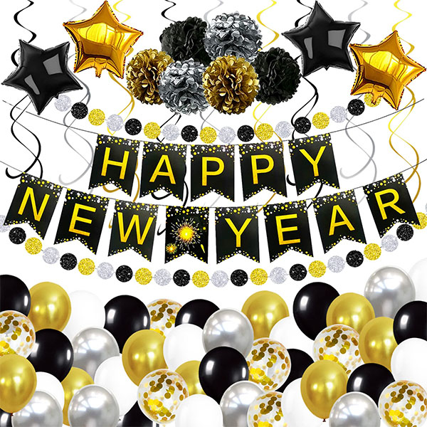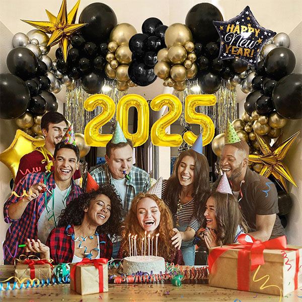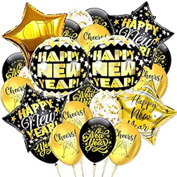 Балоните со новогодишна тема се суштински дел од празничниот декор. Овие живописни балони, во црна и златна боја, создаваат уникатен празничен шмек, внесувајќи радост и стил во новогодишната атмосфера. Нивната издржлива текстура се спротивставува на дефлација, овозможувајќи им да останат полни подолги периоди. Тие можат да се надујат сохелиум или воздух, одржувајќи целосен, тродимензионален изглед. Совршени се и за внатрешна и за надворешна декорација.