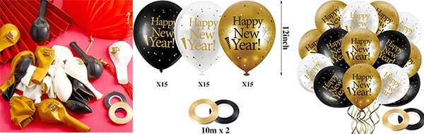 Новогодишните латекс топки се украсни балони достапни во комплети, со новогодишни дизајни како „Среќна Нова Година“ или празнични бои како црна, златна и сребрена. Совршени се за забави и може да се користат за создавање лакови од балон, букети или закачени од таванот. Сите латекс топки со новогодишна тематика понудени од Borun Balloon Factory се целосно изработени од латекс и го задоволуваат CE сертификатот Happy New Party Latex Balloons. Брендот niun поддржува големопродажба на овие новогодишни латекс балони. Овие среќни новогодишни латекс топки се и практични и естетски пријатни, нудејќи и исплатлив и креативен дизајн. Тие веднаш ја воздигнуваат празничната атмосфера и внесуваат топлина и радост на секоја прослава.