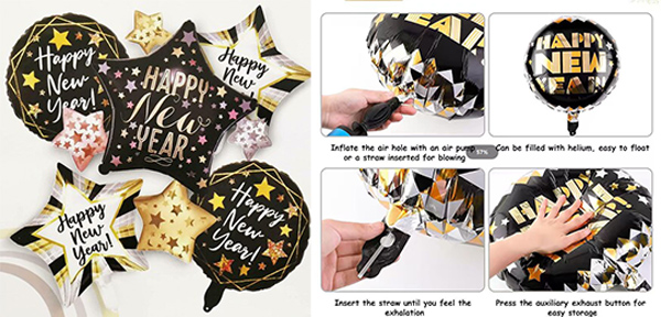 Сите балони од фолија за Среќна Нова Година се поддржани на хелиум и се користат повеќекратно: Комплетот за балони е поддржан на хелиум и е совршена заднина за украсување на новогодишната ноќ. По надувувањето, едноставно штипнете го отворот на новогодишниот балон со миларна фолија и лепилото автоматски ќе се запечати. Лесно се дува и запечатува, лесно се надува и издува, а може да лебди долго време. Можете да ги поставите на вратите или на таваните и ѕидовите.
