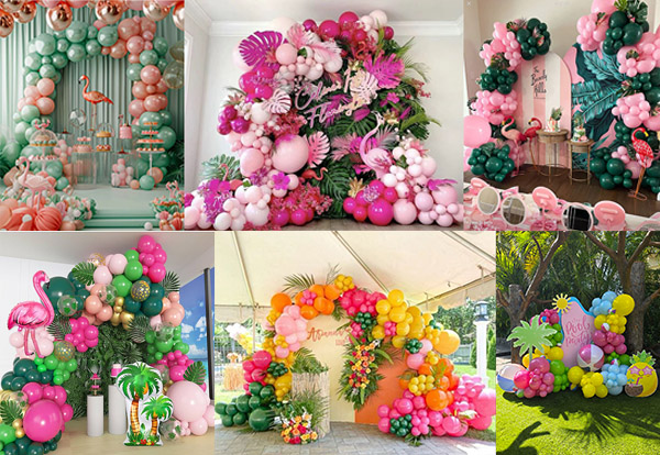 Можеме да го прилагодиме на вашата тема, избирајќи ја вашата уникатна палета на бои. На пример, додавањето на некои балони со ретро-темати ќе создаде тропска и празнична атмосфера за вашето место, додавајќи допир на гламур на вашиот хавајски комплет Гарланд со балони.