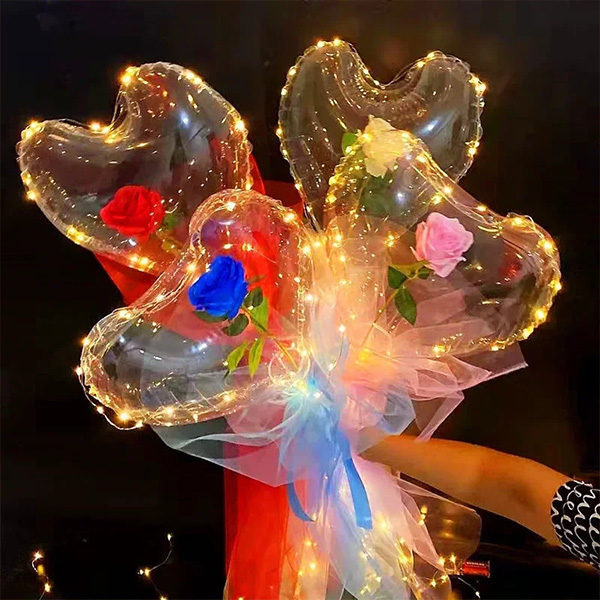 Овој комплет рози од бобо балон во облик на срце произведен од нас содржи брановиден балон во облик на срце, вештачки цвет од роза, лед светилка, светлосен столб, лента и газа. Овој комплет рози со бобо балон во форма на срце има различни вештачки рози за избор. Го усогласивме со панделки и предива со соодветни бои. Големината на овој бобо балон во форма на срце е 7-8 см, што ви овозможува да пополните цвеќиња без да користите експандер на балон или машина за полнење балон. Овие проѕирни пластични балони се многу погодни за различни пригоди, како што се свадби, веренички, матурски прослави, роденденски забави и разни сцени од настани, кои лесно можат да додадат допир на елеганција на вашите активности.
