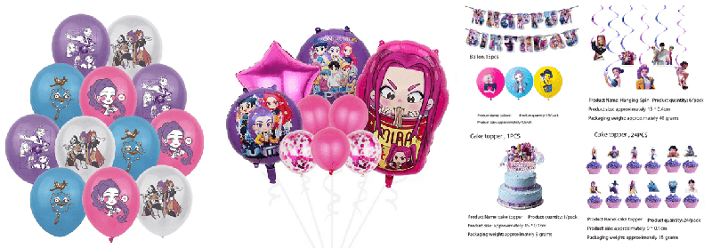 Главно ја вклучува темата „Ловци на демони“.печатени балони од латекс, балони од фолија итн., кои се усогласени со балони и додатоци за балони со ист систем на бои, вклучувајќи хартиени роденденски знамиња, приклучоци за торти и други производи отпечатени со класични слики на ловци на демони. Производите имаат висока заситеност на бои и не се лесно да избледат. Се користат безбедни и еколошки материјали, а рабовите се заоблени за да се спречи случајно гребење на децата додека играат, а се земаат предвид безбедносните барања при семејните забави. Производот е погоден за различни сцени, без разлика дали се работи за детска роденденска забава или забава на обожаватели, може да ги задоволи потребите за извонреден распоред.