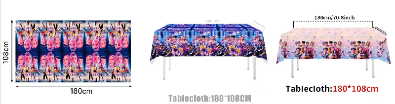 Прекривката за маса е направена од материјали за квалитетна храна. Производите се водоотпорни, отпорни на масло и без мирис. Кога ќе се стави на трпезариска маса, може да ја заштити масата и да ги надополни украсите како што се садовите и банери, правејќи ја целата сцена покохезивна. Нудиме приспособени модели и големини на производи за украсување на чаршафите за забава на ловците на демонот на К-ПОП за да обезбедиме повеќе можности за декорација на забава.