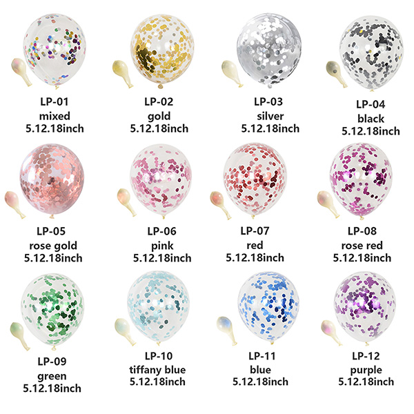 Нашите главни големини на балони за конфети се 5 инчи, 10 инчи, 12 инчи, 18 инчи, 36 инчи. конфети балони исто така припаѓаат на латекс балони, балоните за конфети се поделени на два вида, едниот се балони за конфети од алуминиумска фолија, другиот балони за конфети од хартија. Сјајните балони од фолија изгледаат посветли, а балоните од хартиена фолија изгледаат помеки. што се користи во декорацијата на комплетот балони, ќе додаде многу боја на комплетот балони, исто така ќе ја направи декорацијата посовршена и поубава.
