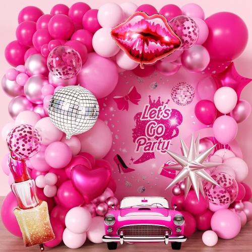 Комплетовите вклучуваат 5-инчни и 12-инчни мат розови балони од латекс, 5-инчни и 12-инчни бисерни розови латекс-балони, 5-инчни и 12-инчни металик розови латекс балони, 5-инчни и 12-инчни балони од бел латекс, 12-инчни розови балони од латекс. балони, балони од фолија со ѕвезди од 18 инчи, завеса од розова фолија, розови балони од фолија Среќен роденден, украси со пеперутки и додатоци како што се точки за лепак, лента за балони и панделка.