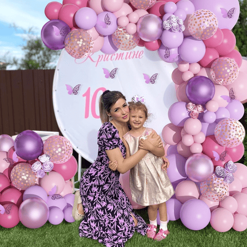 Сетот венец со розови виолетови балони е еден од најпродаваните комплети за балони во NiuN®. Со атрактивни бои и сјајна површина, го сакаат многу луѓе, особено девојките. Доаѓа со разновиден латекс балон. Бојата на нив е розова и виолетова. Покрај обичниот балон од латекс, додадовме и балони за конфети за да зголемиме повеќе слоеви.