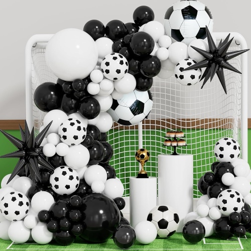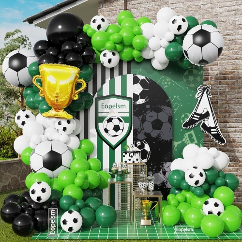 Нашите комплети за венци со фудбалски балони имаат повеќе дизајни, вклучувајќи црно-бели колекции. Тие ги претставуваат класичните бои на фудбалот, дополнително нагласени со балони од фудбалска фолија, внимателно дизајнирани да личат на вистински фудбал по форма и детали. Тие ја зголемуваат темата. Нудиме и комбинации на зелени, бели и црни серии. Зелената ја симболизира бујната трева, каде фудбалските топки радосно се тркалаат по смарагдно-зелениот терен. Тие создаваат енергична, извонредна и автентична атмосфера на стадионот.