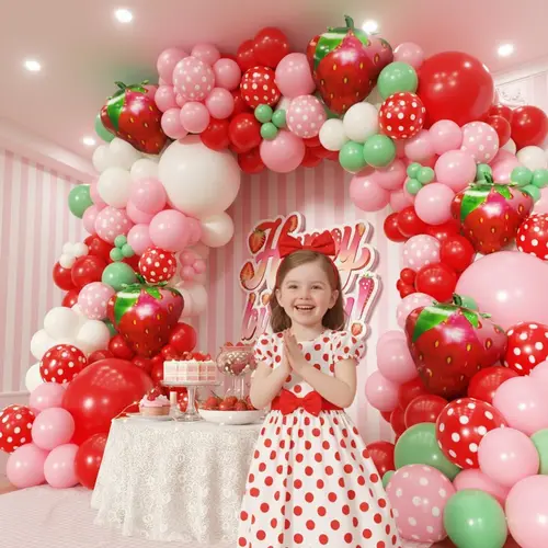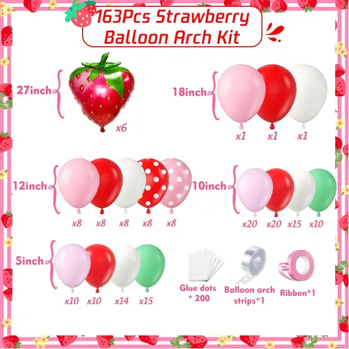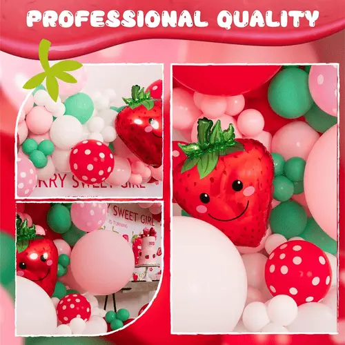 Венец за балон со тема јагода е составен од висококвалитетен балон од латекс и балон од фолија. Најистакнатиот предмет во комплетот е балонот со фолија од јагода од 27 инчи. Покрај тоа, важен дел се и балоните од латекс во него. Балоните од латекс во комплетот се со различни бои и големини, кои можат да создадат прекрасни слоеви. Бојата на балонот од латекс е макаронска розова, мат црвена, мат длабоко розова, ретро бела боја на слонова коска.