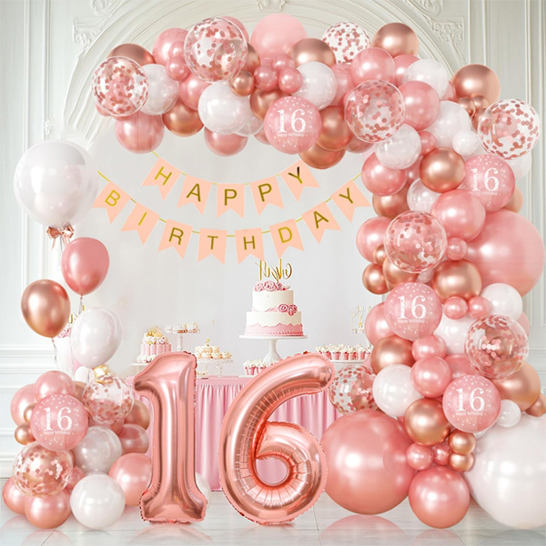 Sweet 16 ballon arch овој пакет вклучува балони од латекс, балони од фолија, роденденски банери, точки за лепило, панделки итн.с.