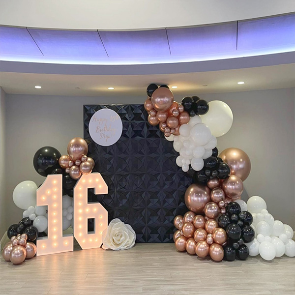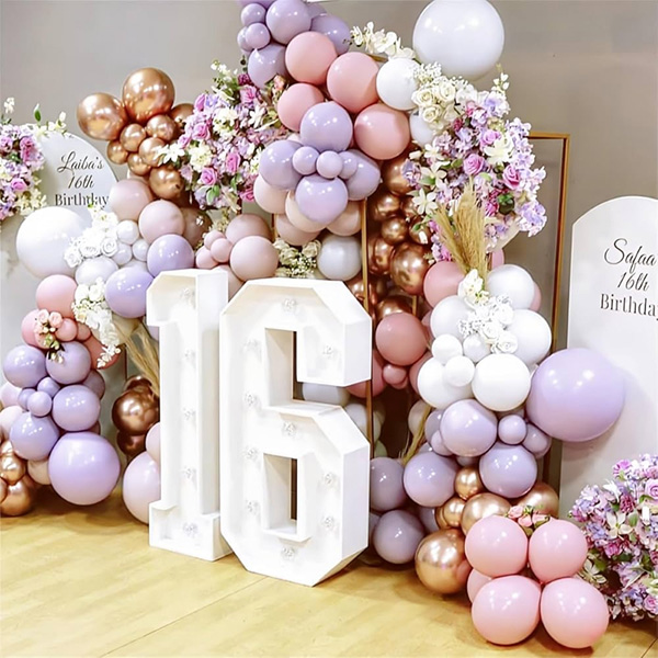Балон венец со 16 лед светло:Нашата фабрика, исто така, лансираше балон венец со 16 години старо LED светло. Светлата со лед броеви се направени од еколошки материјали ABS и LED за да обезбедат светли и трајни светлосни ефекти. LED светла со бројки и букви кои можат да светат во темнина. Мекото осветлување создава опуштена и удобна атмосфера и додава уникатен шарм во секоја соба. Тие можат да бидат прикажани независно или да се закачат на ѕидот, на платното или да се стават во просторот за прием за употреба за време на настани или прослави. LED нумерички светла со балонски сводови за венци, погодни за создавање на извонредна атмосфера за забава, се суштински реквизит за правење уникатни и незаборавни фотографии, додавајќи незаборавно чувство на церемонија на вашиот 16-ти роденден.