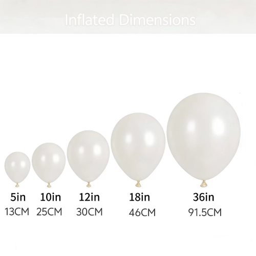 Редовни големини на балони со бела бисерна боја на залиха: 5,10,12,18,36 инчи (круг). Достапни се сопствени големини од 10 до 36 инчи, како и прилагодени бисерни бели балони во форма на срце. MOQ може да се преговара.