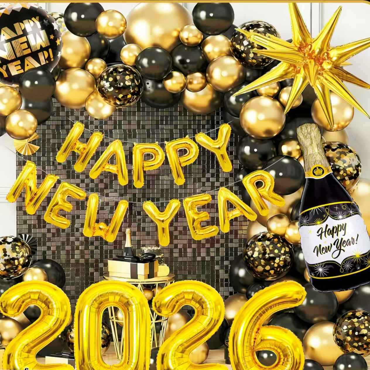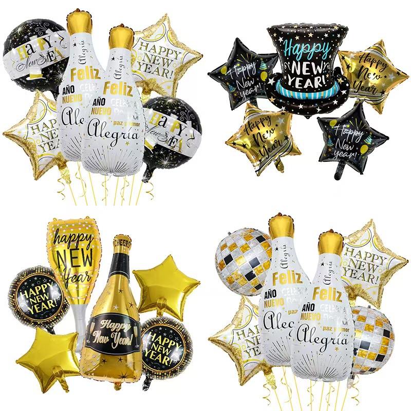 Размислете за комплетот со новогодишна тематика. Има балони од фолија кои личат на шишиња од шампањ. Вклучува и балони со број „2026“, украсни балони со ѕвезди и друго. Главните бои се црно-златни или златно-бели. Полно е со новогодишно празнично веселба. Лесно може да направи луксузна и свечена новогодишна забава.